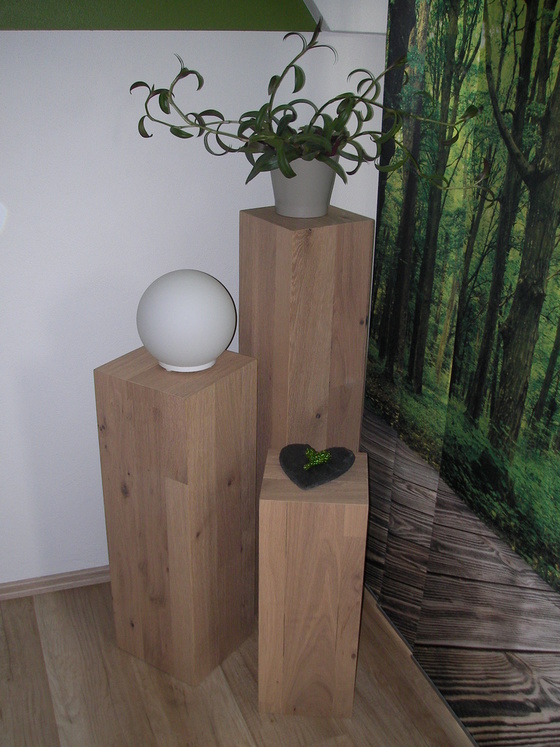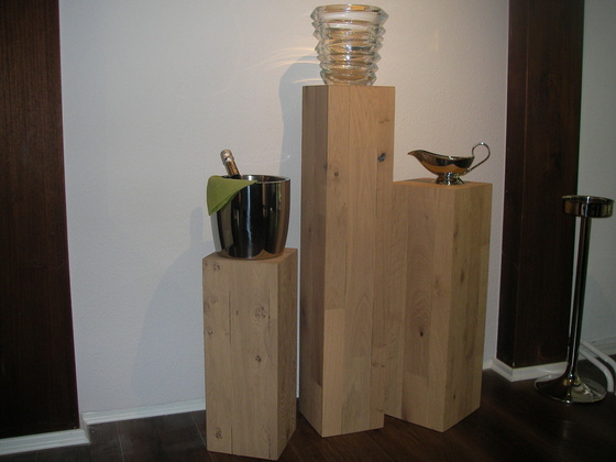 Schlicht und doch sehr dekorativ sind unsere Holzsäulen. Egal ob aus schwerem Massivholz oder aus auf Gehrung geschnittene Holzplatten, mit diesen Säulen sind ihrer Fantasie keine Grenzen gesetzt. Am besten kommen sie als dreiteilige Gruppe zur Geltung, wobei die Maße immer variieren.