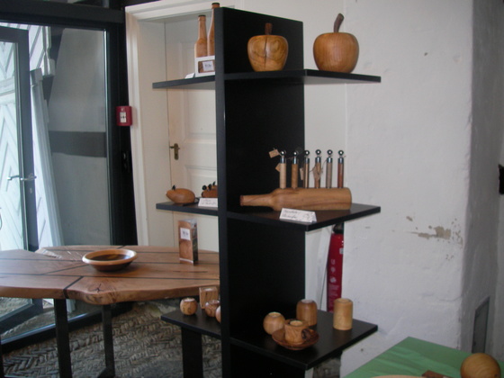 Rechts im Bild sehen sie eine Dreiergruppe Säulen aus rustikaler Spalteiche.
